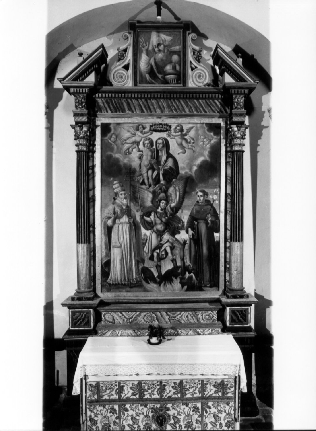 Struttura architettonica caratterizzata da due colonne laterali scanalate che incorniciano il dipinto; in alto al centro tra le due parti del timpano spezzato la cimasa