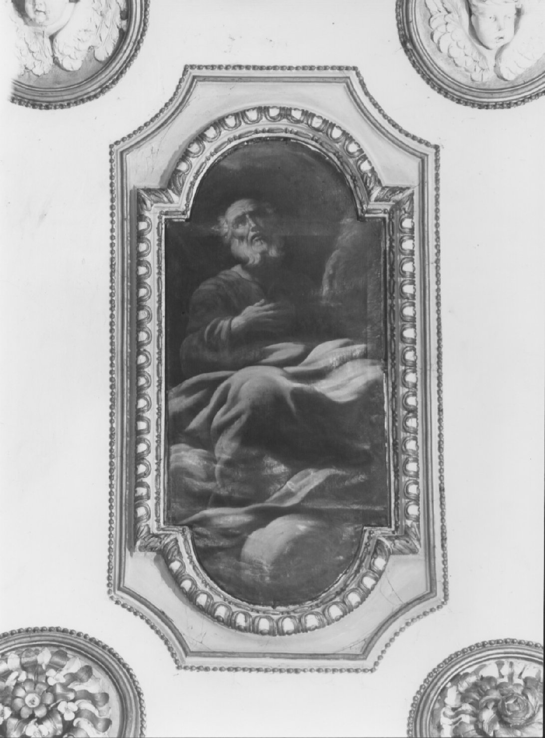 Dipinto inquadrato da una ricca cornice mistilinea in stucco dorato, decorata con foglie d'acanto, ovuli e fuseruole