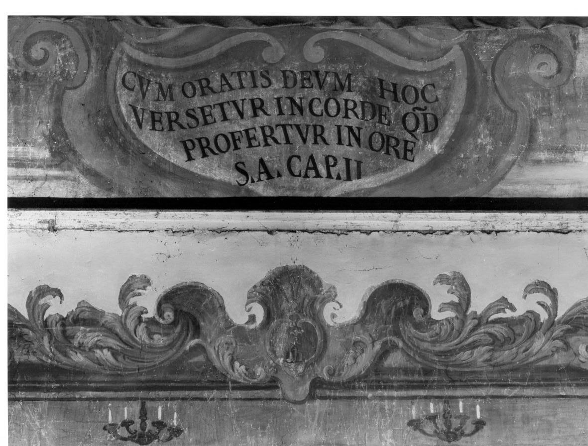 - ISCRIZIONI nel cartiglio - CUM ORATIS DEUM HOC/ VERSETUR IN CORDE Q(UO)D/ PROFERTUR IN ORE/ S(ANCTUS) A(UGUSTINUS) CAP(---) II - lettere capitali - a pennello -