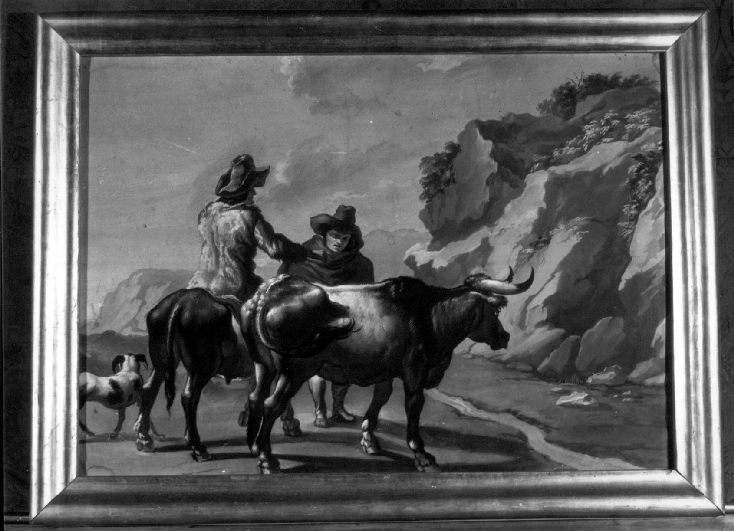 In primo piano un bue; in secondo piano un pastore a cavallo addita l'acqua di un ruscello ad un pastore appiedato. All'estrema sinistra un cane. Il paesaggio è dominato sulla destra da una quinta rocciosa. Il dipinto è provvisto di cornice lignea modanato e dorato dello spessore di cm. 7