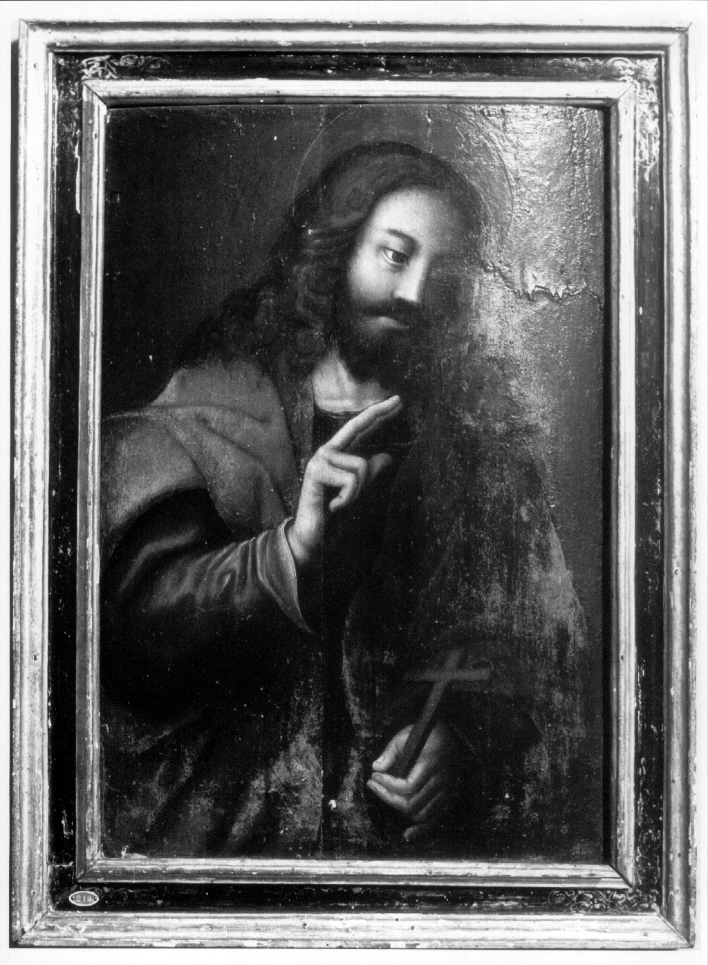 Figura del Cristo benedicente: con veste verde, manto rosso, recante una croce nella sinistra. La tavola è provvista di cornice di legno dorato e verniciato in nero, con motivi decorativi dorati agl angoli, dello spessore di cm. 8