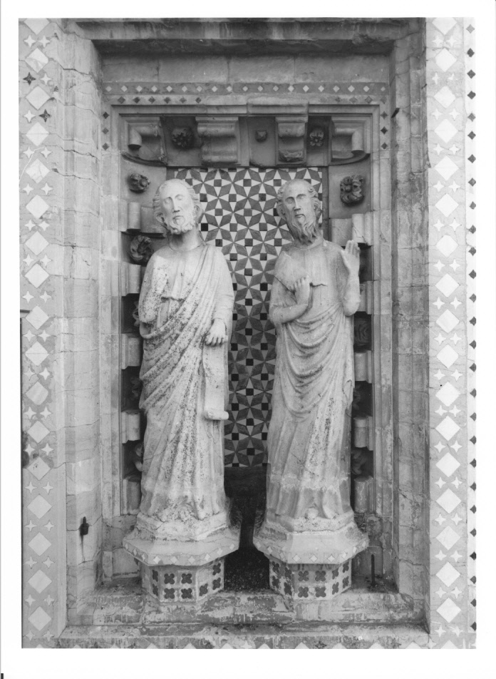 - NOTIZIE STORICO CRITICHE Le statue poste nelle edicole ai lati del rosone raffigurano i Profeti minori, che sono in numero di 12 e sono detti "minori" in ragione della maggiore brevità dei loro scritti. Non è possibile identificare il profeta raffigurato nella statua in esame, in quanto presenta solo il generico attributo del cartiglio. Si può solamente escludere che si tratti di Naum o Abacuc, dato che questi profeti sono raffigurati nelle due statue contenute nell'edicola in basso a destra del rosone, l'unica recante un'iscrizione che permetta di identificare i Profeti che vi sono collocati. Il Profeta in esame, insieme ad altri cinque (quello posto accanto, la coppia nell'edicola mediana a destra e quella nell'edicola inferiore a destra), fu eseguito probabilmente negli anni tra il 1364 e il 1390, periodo in cui si succedettero nella carica di capomastro dell'Opera del Duomo tre scultori senesi. Nel 1364 troviamo come capomastro Paolo d'Antonio da Siena, con la qualifica di "sculptor lapidum" (Archivio Opera Duomo di Orvieto, Rif., 1364); nel 1373 subentra nella carica un altro senese, Giovanni di Stefano, architetto e scultore (ivi, Rif. 1373-1384, 1375, marzo, 11), il quale aveva lavorato nel 1366 in una cappella in S. Maria della Scala a Siena e nel 1386 attendeva a lavorare in una cappella nella Basilica di S. Pietro a Roma, dove era già stato deputato, prima di andare a Orvieto, alla fabbrica di S. Giovanni in Laterano. Questi viene sostituito durante la sua permanenza a Roma (1386-88) da Luca di Giovanni da Siena, anch'egli scultore, destinato ad assumere la carica di capomastro nel 1390. Questi tre artisti, insieme alle loro maestranze, realizzarono probabilmente le statue di profeti citate. Queste opere riflettono, secondo Carli (1965, p. 68), lo stesso gusto e la stessa cultura delle maestranze attive nel Duomo di Siena nell'ottavo decennio del '300, che, sotto la guida di Giovanni di Cecco, eseguirono i tabernacoli che incorniciano il rosone di facciata e i busti di profeti in essi contenuti (Carli, 1979, pp. 26-27). Dei maestri di pietra - a giudizio di Carli piuttosto modesti - che eseguirono tali opere rimangono i nomi, ma nessuno di essi è collegabile a una scultura in particolare