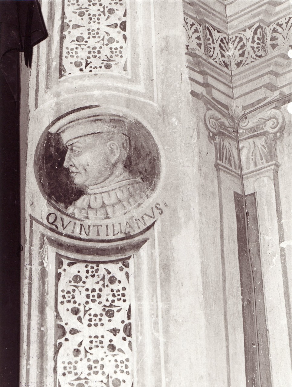 - NOTIZIE STORICO CRITICHE La Biblioteca venne costruita tra gli ultimi del sec. XV ed i primi del sec. XVI per volontà di Antonio Alberi, precettore del Papa Pio III Piccolomini. Lo stesso Alberi provvide ad ornare la biblioteca della serie di affreschi in monocromo rappresentanti poeti, filosofi, giuristi, retori, grammatci dell'antichità, prima di morire il 20 novembre 1505 (Perali, 1919, p. 161). L'analisi stilistica degli affreschi, nonostante le cattive condizioni della maggior parte di essi, consente di ipotizzare un'esecuzione da parte di pittori della bottega di Luca Signorelli (Perali, 191, p. 283; Scarpellini, 1964, p. 145).Il pittore cortonese era presente ad Orvietoproprio in quegli anni. Nella lunetta è rappresentato Quintiliano, oratore e retore, vissuto tra il 40 d. C. ed il 100 d. C