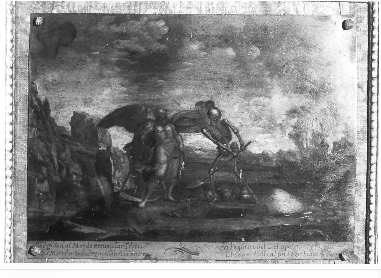 In un paesaggio aspro e roccioso è raffigurato un angelo con la falce in mano, accanto all'immagine della Morte che sta scavando una fossa con una pala: ai suoi piedi sono visibili dei teschi. Cornice in legno dorato