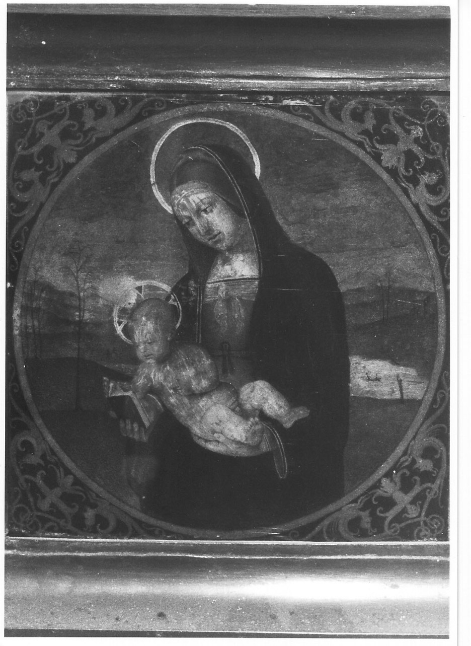 In uno spazio circolare è raffigurata (per i due terzi dell'altezza) la Madonna che regge il Bambino, al quale porge un libro aperto. Sullo sfondo è visibile un paesaggio collinare con alberelli. Gli angoli del dipinto quadrangolare sono decorati con grottesche. Cornice in legno