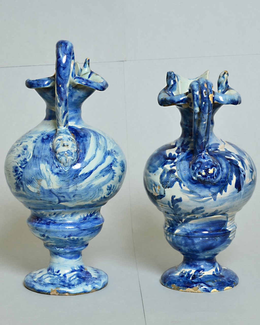 Versatore su alto piede a pianta circolare; corpo a balaustro; ansa verticale ricurva con mascherone alla base; bocca trilobata. Decorazione blu su fondo bianco. Un versatore con raffigurazione di tre putti, uno con arco e freccia (Amorino), uno con trombe e uno alato; nel fondo paesaggio con rocce, un castello e diversi uccelli raffigurati come onde; sul piede un uccello con le ali aperte. Sull'altro esemplare due putti con cavallo