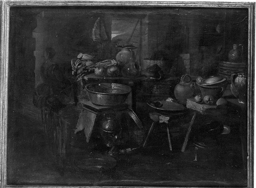 Il dipinto raffigura l'interno di una cucina: finestra; tavoli; sgabelli; ripiani. Oggetti: vasi; anfore; ceste; pentole. Figura di donna seduta
