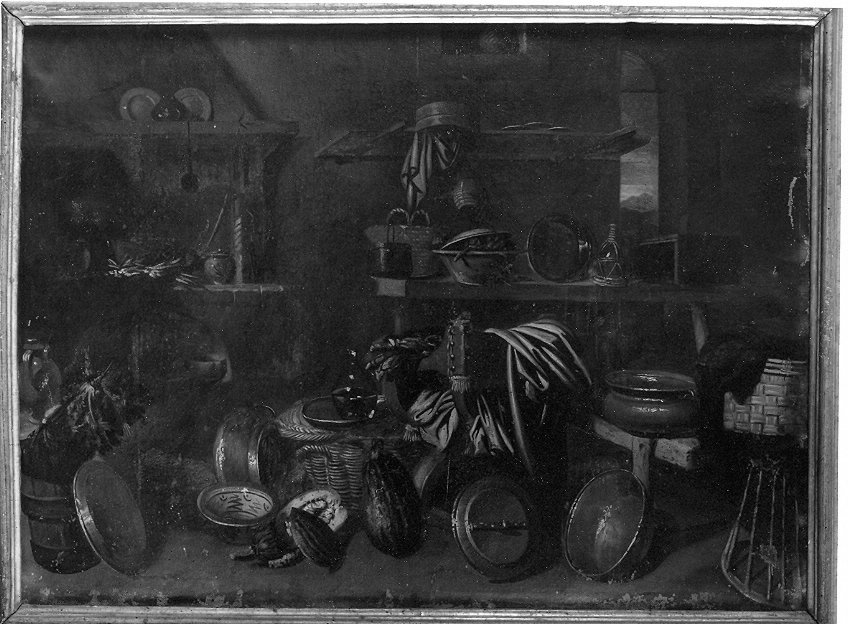 Il dipinto raffigura l'interno di una cucina: finestra, camino, ripiani, tavoli, sedia, panche. Oggetti: pentole, vassoi, ceste, fiaschi, piatti, vasi, drappi. Frutta