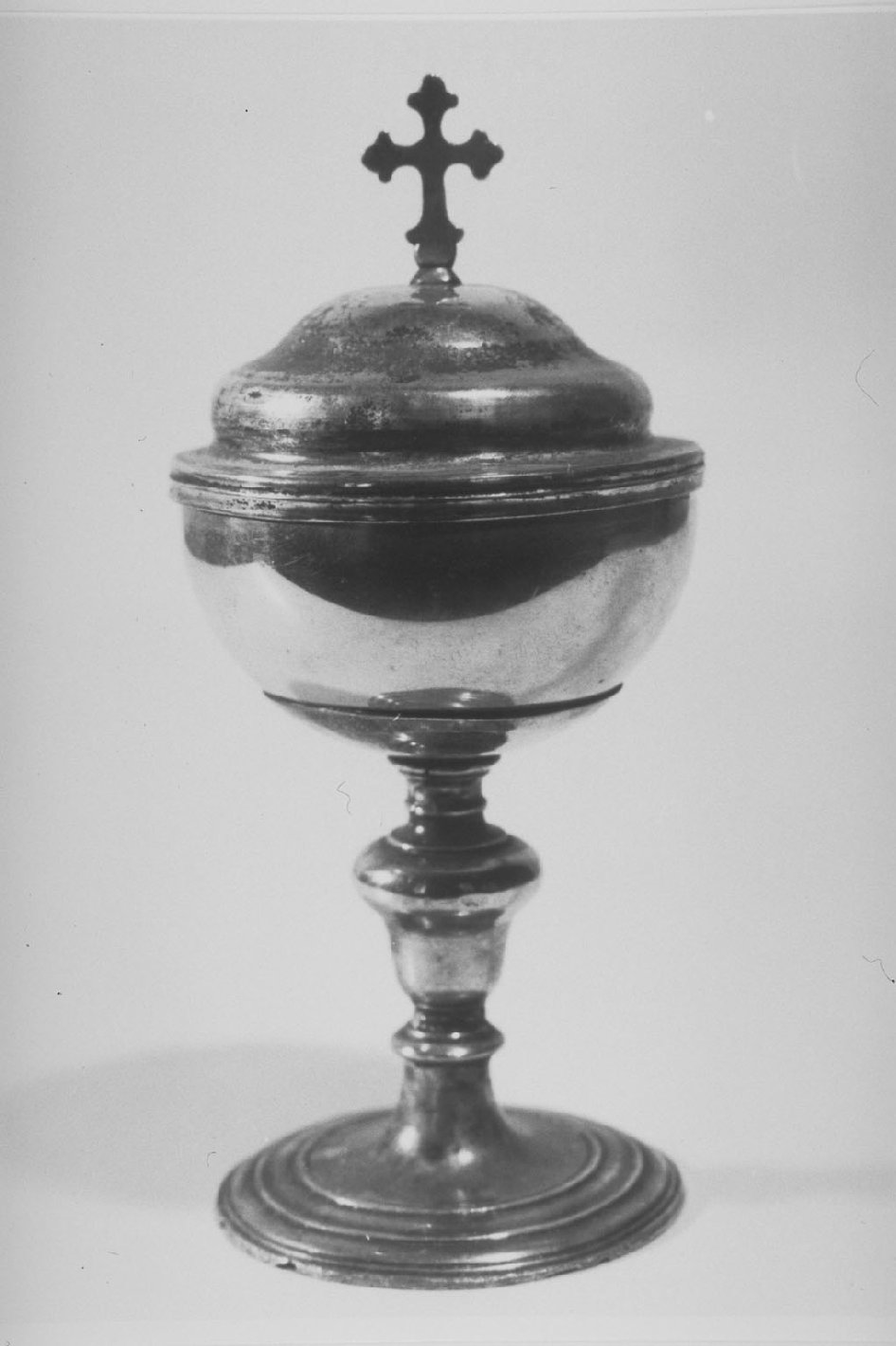 Vaso sacro utilizzato per la custodia delle ostie consacrate e la distribuzione eucaristica ai fedeli. Piede: circolare. Fusto: con nodo a forma di vaso. Sottocoppa: liscia. Coppa: liscia. Coperchio: bombato e sormontato da una crocetta apicale a terminazioni trilobate