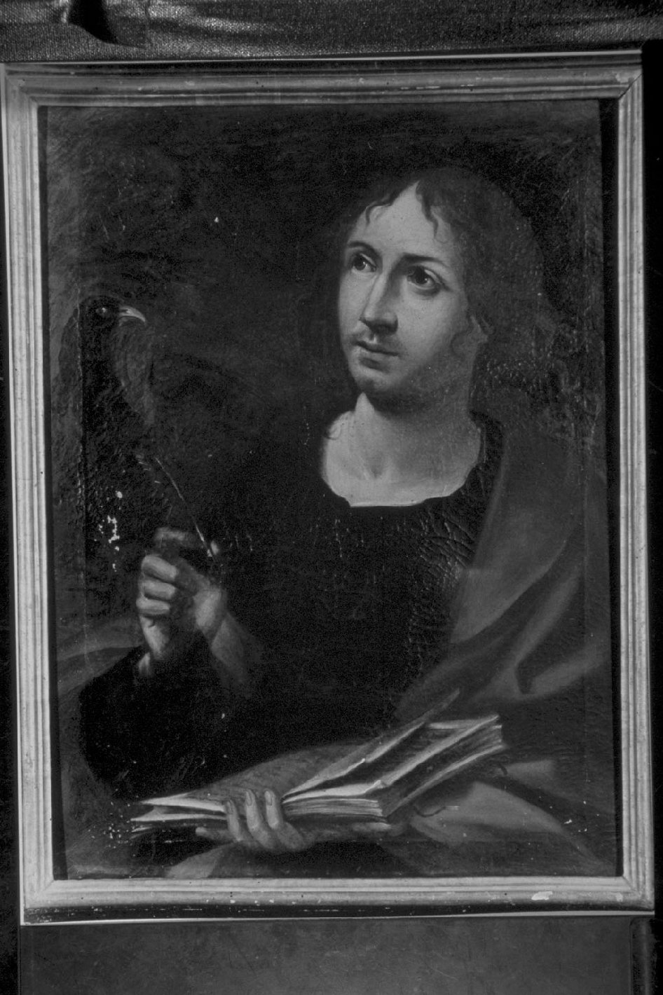 - NOTIZIE STORICO CRITICHE L'opera in esame è citata solo dall'inventario Cecchini (1932) che indica come datazione il secolo XVII; fa parte di un gruppo omogeneo di dipinti raffiguranti la serie degli apostoli. Per l'accurato chiaroscuro e per il ritratto acuto e penetrante sono da considerarsi opera di un pittore di discreta personalità del secolo XVII, anche se il cattivo stato di conservazione ne impedisce una lettura integrale. Secondo la tradizione orale dei monaci benedettini questa serie di dipinti fu acquistata a Napoli nel secolo XVII. L'opera in esame raffigura probabilmente l'apostolo Giovanni, infatti l'aquila e il libro sono suoi attributi. La tipologia ivi rappresentata è inoltre corrispondente a quella di Giovanni apostolo: un giovane aggraziato, sbarbato con lunghi capelli e non corrisponde invece a quella di Giovanni nelle vesti dell'evangelista: un uomo anziano con barba grigia