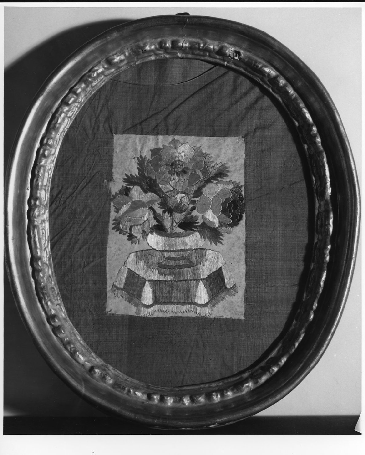 Ricamo di seta su un foglio di carta di forma rettangolare. Al foglio è appoggiato un taffetas di seta che lo incornicia in una finestra rettangolare. Il tutto è schiacciato fra due vetri in modo che sia dritto che rovescio siano visibili. I vetri sono fermati da una cornice in legno dorato e stuccato. MOD.DEC.: il ricamo rappresenta un vaso con tre grandi rose, appoggiato su un tavolo esagonale. COLORI: ricamo: fondo bianco, decorazione verde, giallo ,rosa, blu e loro gradazioni. Passepartout: verde. Cornice: oro. SCHEDA TECNICA: vedi scheda cartacea