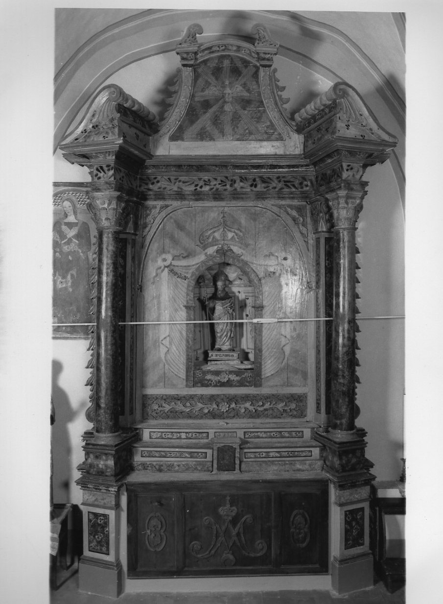 Alzata di altare che incornicia una raffigurazione religiosa (statua), la cui struttura presenta elementi architettonici (colonne, architrave, cimasa ecc.)