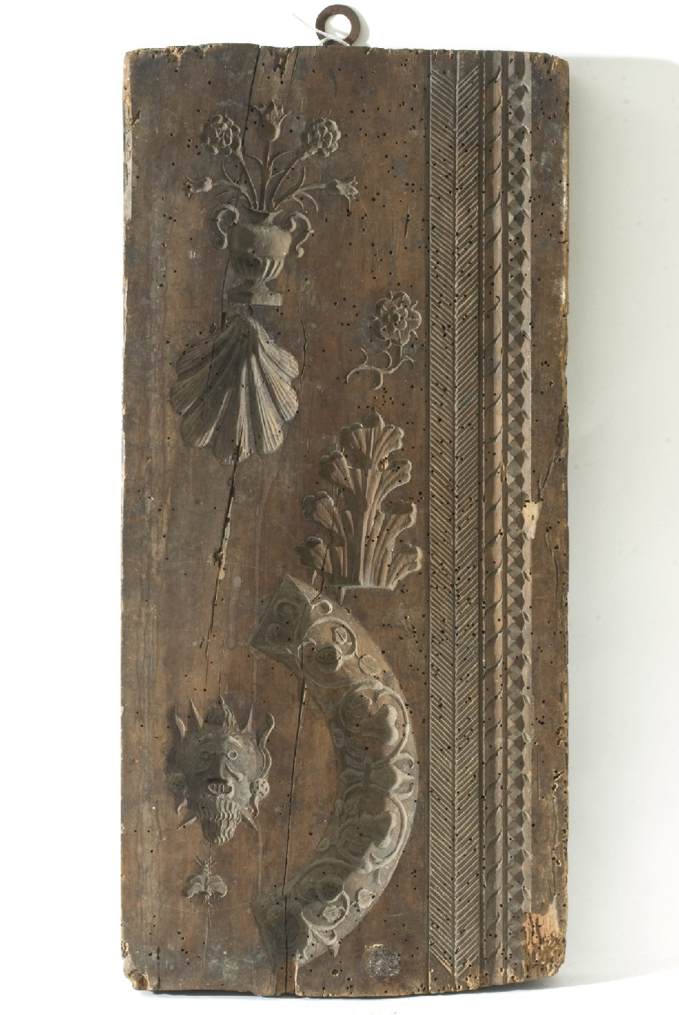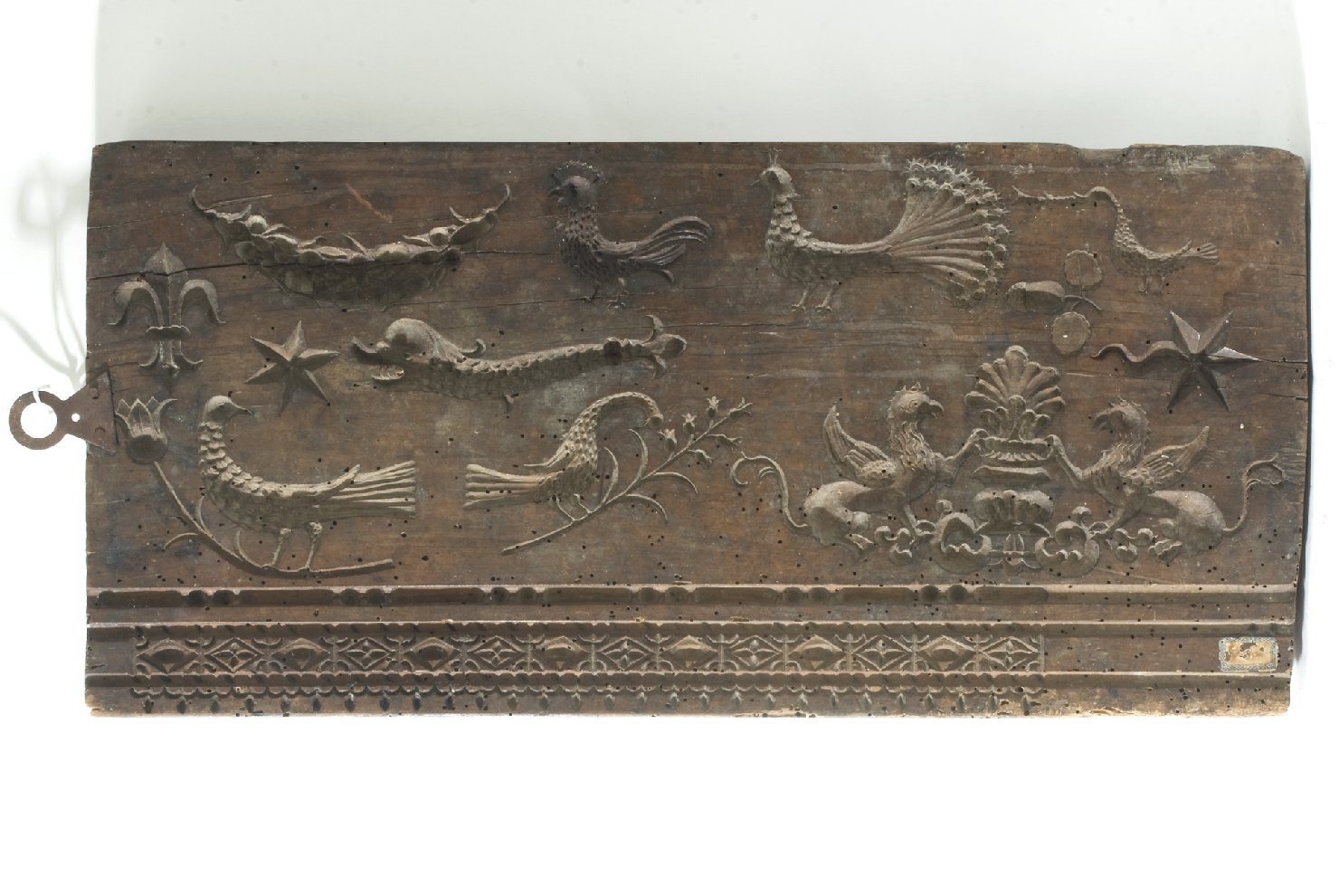 - NOTIZIE STORICO CRITICHE Lo stampo è stato individuato durante il riscontro inventariale dell'agosto 1999. Nell'Inventario generale dei dipinti esistenti nella Pinacoteca Vannucci, al n. 807, è ricordato uno "stampo in legno per pasticceria del XVI secolo, di cm. 28X59 proveniente dai Musei dell'Università". In un elenco degli oggetti della Galleria Nazionale dell'Umbria imballati in casse in occasione del trasferimento della raccolta a seguito dei lavori del palazzo dei Priori, risalente forse al 1952-53 e firmato da Santi per Martelli, è ricordato uno " stampo in legno quattrocentesco", del quale, però, non vengono riportate le misure
