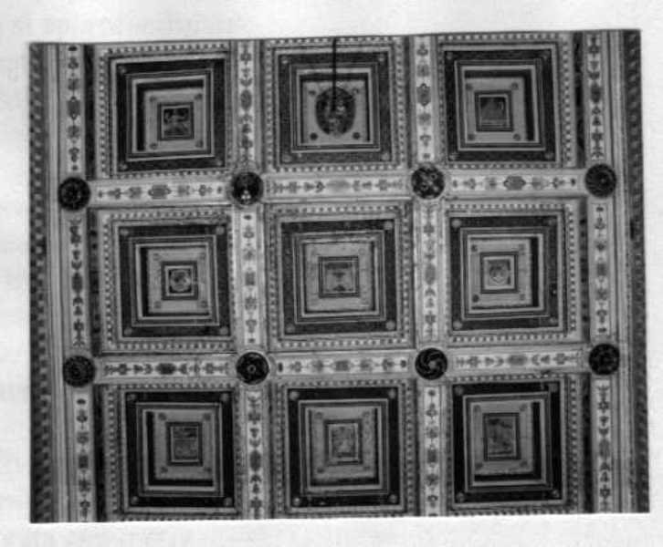 Porzione di tre cassettoni quadrangolari a gradoni che si approfondiscono verso il centro ornati sui vertici da motivo a rilievo di rosette policrom e di varia foggia ovvero da motivo di fascio circolare d'alloro, includent e a rilievo: banda con trimonti allineati tra 2 corone d'alloro, oppure al bero di corniolo su trimonte superfici orizzontali e verticali del primo g rado dipinte quattro cornici modanate degradanti in profondità, decorate c on motivo di acanto, dentelli, fusarola e foglie lanceolate superficie ori zzontale del secondo grado dipinta e ornata ai vertici da borchie dorate t re cornici modanate degradanti, decorate a perline, acanto e fusarola supe rficie in verticale dipinta cornici multiple modanate superficie del terzo grado dipinta ed ornata ai vertici da borchie dorate cornici multiple mod anate pannelli di fondo quadrangolari dipinti sull'esterno del primo grado , fasce con motico decorativo a candelabra con arpie, vasi, testine alate, teste antropomorfe, alberi di corniolo e tabelle sagomate includenti figu re superficie in verticale decorata con motivi di grottesche superficie or izzontale del secondo grado decorata con motivo di clipei interrotti da el ementi vegetali ed includenti rosette alternate a trimonti nel fondo, i tr e scomparti includono motivo
