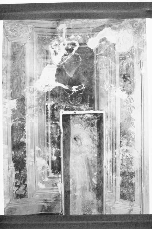 Sui due lati, motivo decorativo di lesene con capitelli a foglie d'acanto e mostri marini lesene a fondo blu includenti motivo di festone di spighe di granoturco, pomi e altri frutti, con foglie e nastri, pendente da borch ia dorata al centro, quadratura dorata con motivo di conchiglia tra elemen ti vegetali sui due vertici superiori, e specchiatura a fondo rosso pompei ano con motivi decorativi dorati nella zona inferiore ds, getto d'acqua ch e scaturisce e scende a cascata tra zampilli e nube di vapori