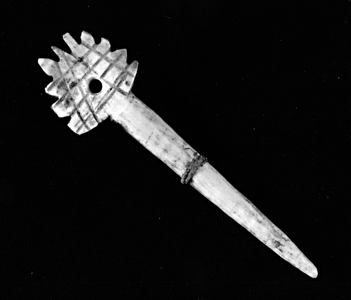 estremità superiore dentellata a 10 punte, incisa con motivi a losanga e foro centrale; estremità inferiore a punta