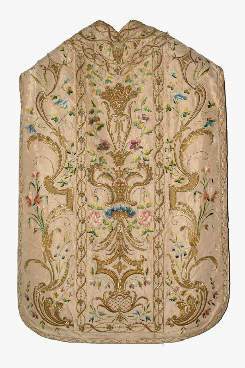 Un gallone ricamato divide il parato in tre zone: al centro reca un motivo a sviluppo verticale, con una cartella alla base, con interno a griglia, da cui si genera un elemento a lati mistilinei, con la zona interna a quat tro petali lanceolati. Segue un'infiorescenza rovescia da cui partono ampi e foglie allungate e fiori di rosa aperti e a bocciolo con calice posto al centro di due volute concavo convesse, sorta di vaso da cui scaturisce un trifoglio, base di fiori viola e tralci, con campanule rovesce inscritte, che sorreggono un calice di cinque petali. Ai lati tralci uniti a element i di tipo architettonico ad andamento sinusoidale speculari, con innesti d i campanule e altri fiori rosa. Gallone ricamato a motivi sinusoidali intr ecciati con un nastro zigrinato, uniti nel mezzo da una sequenza verticale di rametti stilizzati. Orla la pianeta un gallone a semplice nastro ondul ato intrecciato a formare occhielli. Ricamo in oro filato riccio e lamella re, punto steso, piatto e imbottito