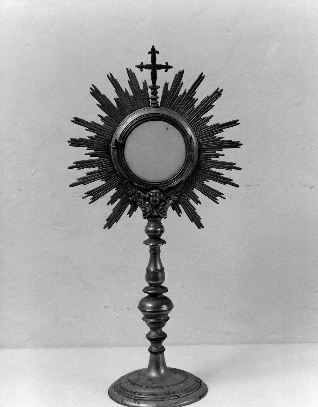 Ostensorio raggiato a sole. Piede modanato a base circolare e fusto a bala ustro con sezione circolare e nodo a vaso. Il ricettacolo ha un innesto a baionetta con il raccordo nascosto da un cherubino, ed una raggiera a fasc i di raggi. Terminazione con crocetta apicale di tipo floreale. Teca a luc e circolare