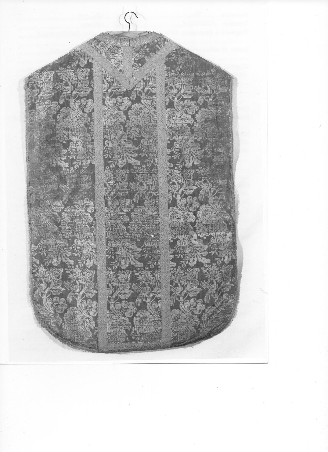Pianeta modello canonico romano con manipolo. Galloni in seta gialla a motivo geometrico. Fodera in tela di lino. Lampasso lanciato. Fondo taffeats, decorazione ottenuta per trame lanciate legate in diagonale direzione Z da un ordito prelevato dal fondo. Modulo decorativo: serie di rami su cui sta un uccello del paradiso che becca un grappolo d'uva, una farfalla si posa su un gruppo di fiori. Dal ramo nascono foglie, ciliege, un fiore a corolla. Accanto è un'anfora ad embriacature