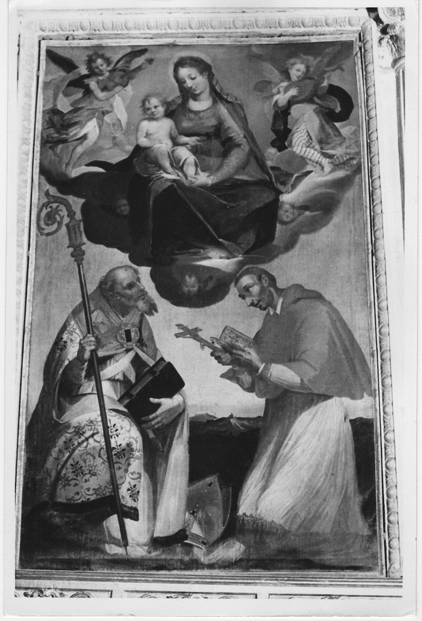 Nel dipinto è raffigurata la Madonna col Bambino fra angeli musici. Ai suoi piedi sono presenti S. Nicola di Bari e S. Carlo Borromeo. S. Nicola è rappresentato in abiti vescovili a capo scoperto, poichè la mitria è appoggiata a terra, con il pastorale e un libro in mano. E' seduto e sta ascoltando S. Carlo Borromeo, riconoscibile dal naso adunco. Quest'ultimo è inginocchiato ed è raffigurato in abiti cardinalizi con un crocifisso e un libro in mano. I due santi stanno meditando sul mistero della Passione di Cristo