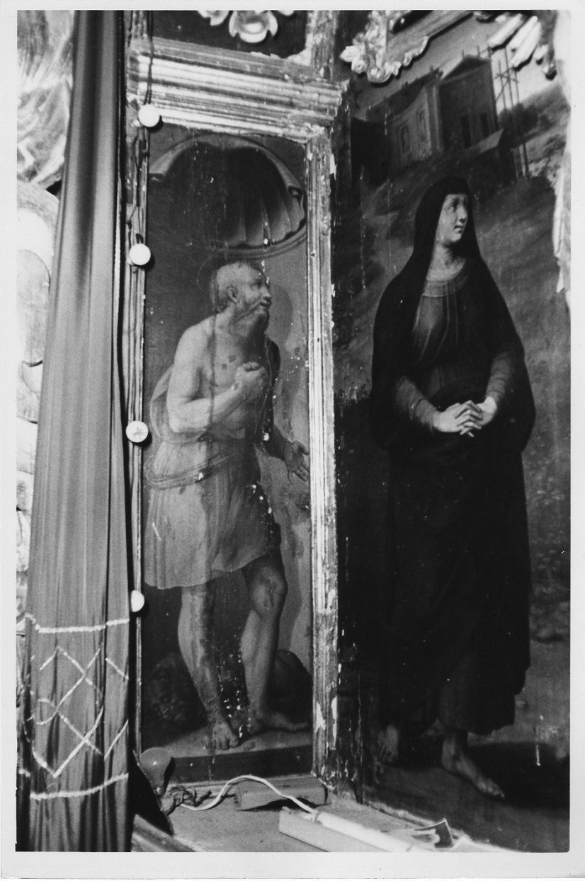 Nel pannello a sinistra della pala d'altare, collocata a mò di sfondo del crocifisso ligneo, è rappresentato S. Girolamo come eremita con la barba, seminudo mentre con una pietra si batte il petto. Ai suoi piedi vi è il leone, uno dei suoi principali attributi. Il suo sguardo è rivolto verso la Vergine