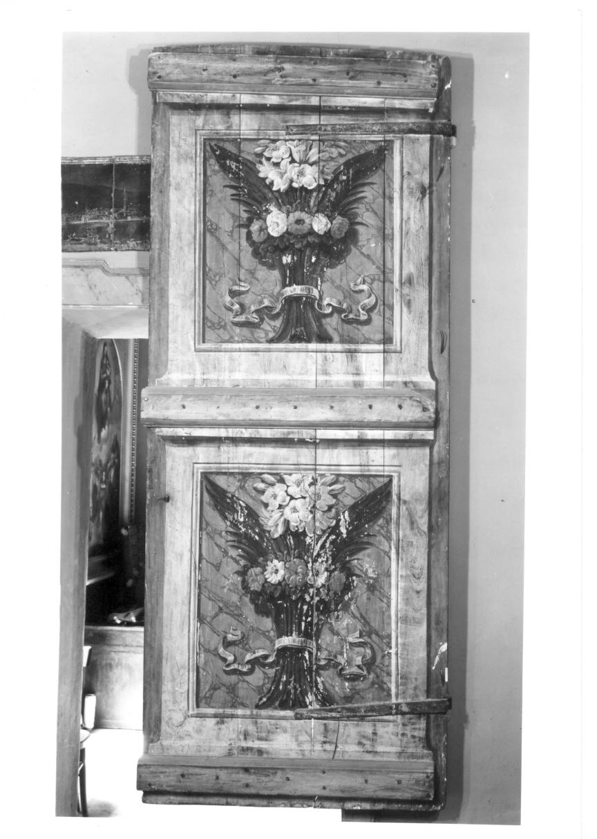 Porta dipinta. Su una faccia, Matrimonio mistico di Santa Caterina. Sull'altra faccia, quattro specchiature con cornici modanate decorate da mazzi di fiori su fondo a finto marmo