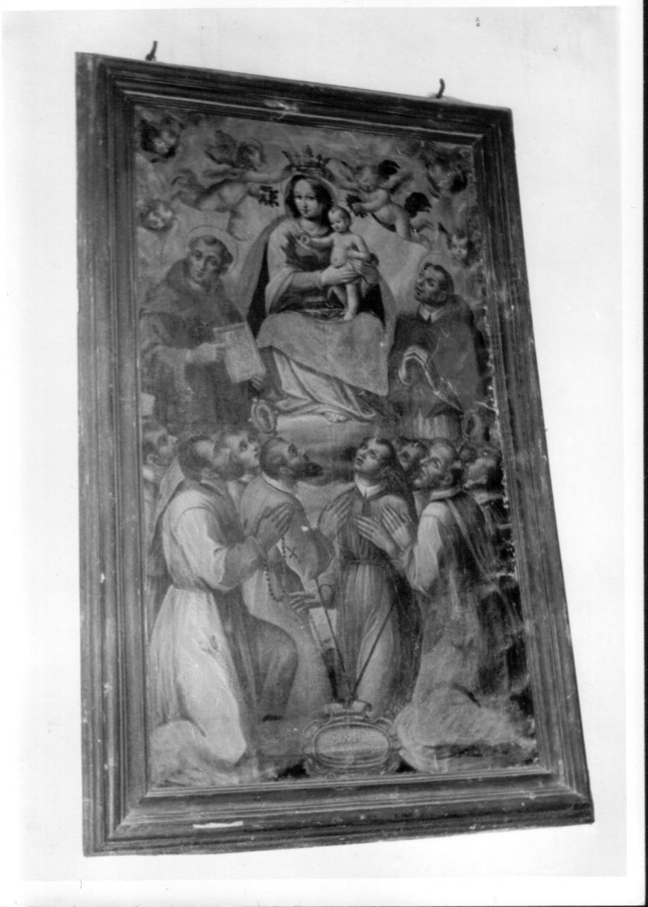 Soggetti sacri. Personaggi: Madonna; Gesù Bambino; Santo francescano; San Carlo Borromeo. Figure: Angeli; Cherubini. Figure maschili. Oggetti: Libro; Corona; Mazze processionali; Corona del rosario. Abbigliamento religioso. Simboli: Aureola