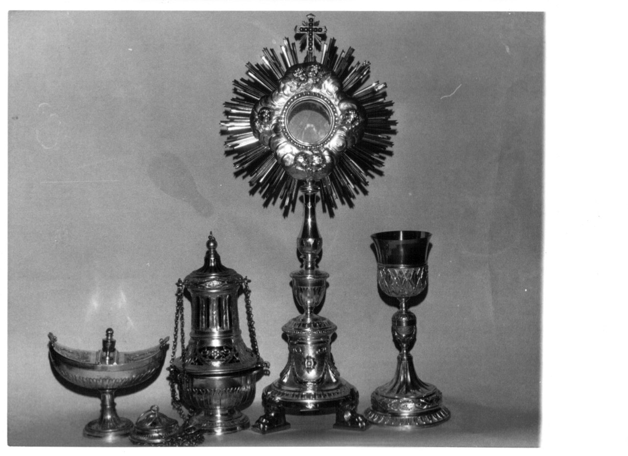 Ostensorio raggiato tondo, lavorato. Piede circolare modanato, poggiante su tre piedini a zampa leonina, dorati ornata da un motivo di foglie d'oleandro che si ripete anche sul fusto, da festoni e simboli eucaristici dorati. Raggiera a fasci dorati, con nuvole e testine angeliche. Cornice della teca con perlinatura. Crocetta apicale con perline e terminazioni floreali