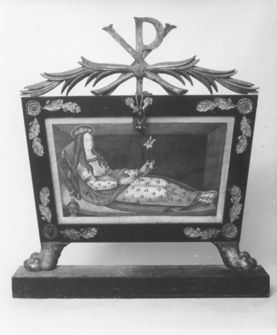 Cornice su zampeleonine,costruita in forma trapezoidale; il perimetro interno della specchiatura è ornato da elementi vegatali applicati e da cornucopie sulla sommità