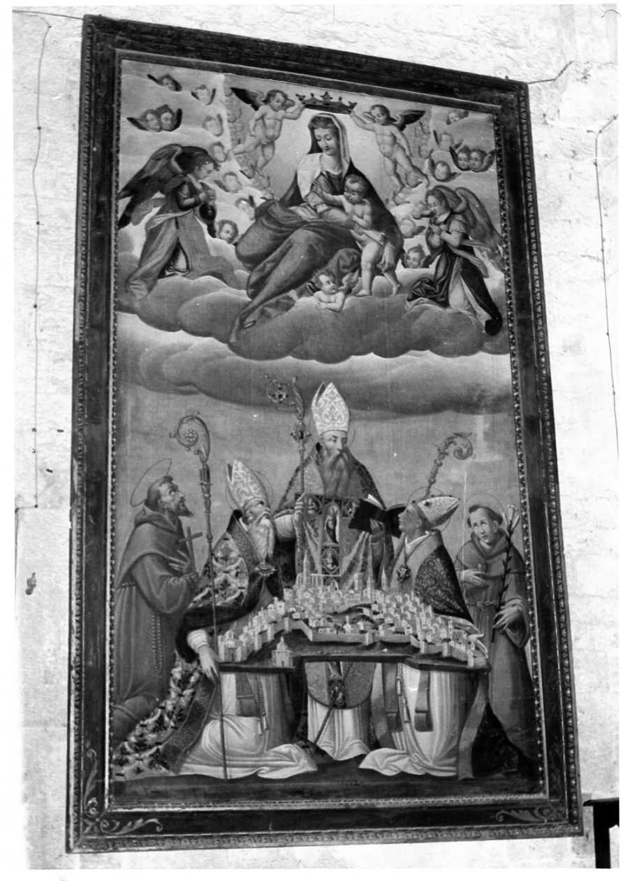 Madonna con Bambino tra cherubini e angeli sopra una nuvola, sotto i santi Francesco d'Assisi, Callisto, Fortunato, Cassiano, Antonio da Padova e la città di Todi