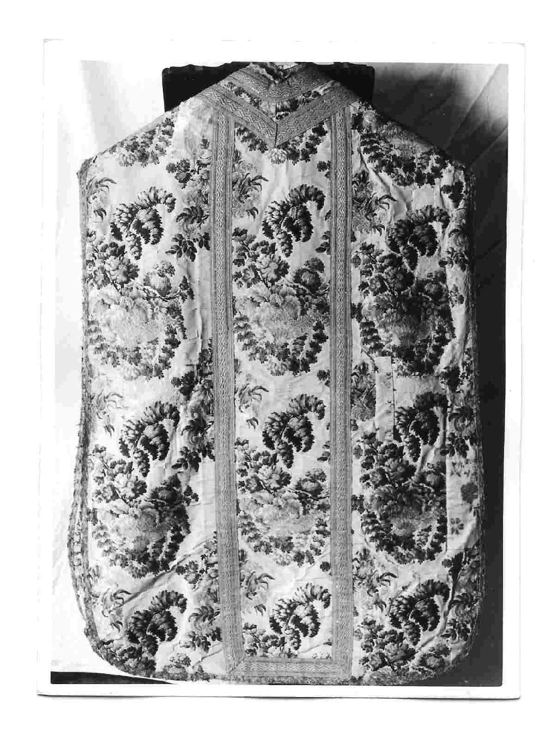 Pianete in broccato, fondo in seta avorio e fiori variopinti, con fili d'argento