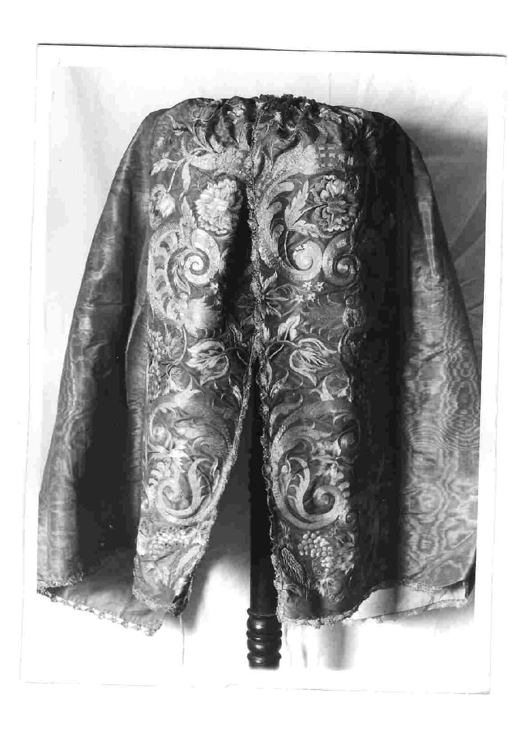 si tratta di un conopeo ricamato in oro e sete colorate, a motivi floreali e vegetali su fondo rosso scuro. La fodera è in seta gialla