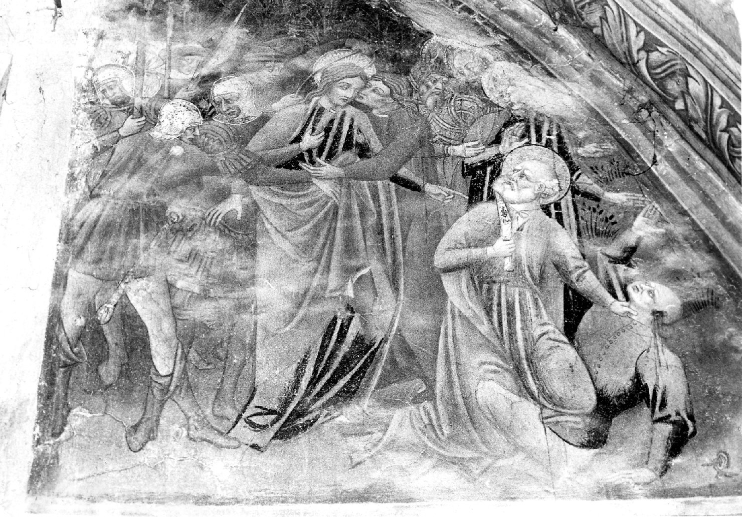 A destra della finestra, Cattura di Cristo, sul fondo e a sinistra è la schiera dei soldati armati di lancia che afferrano Cristo mentre Giuda a destra lo abbraccia e lo bacia, è inginocchiato Pietro che afferra il servo cui ha tagliato l'orecchio e si rivolge verso Cristo (le armature dei soldati sono ocra e rosso, le vesti degli altri personaggi sono rosse, violette, grige e ocra)