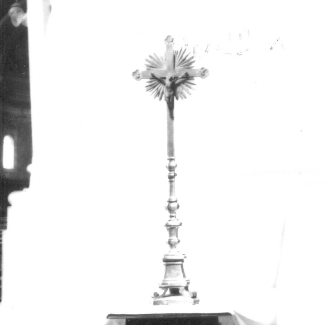 La croce, i cui bracci sono arricchiti dalle consuete terminazioni fogliacee e dalla raggiera, poggia su una base a mo' di candeliere. Il Cristo che vi è sovrapposto è di ottone fuso