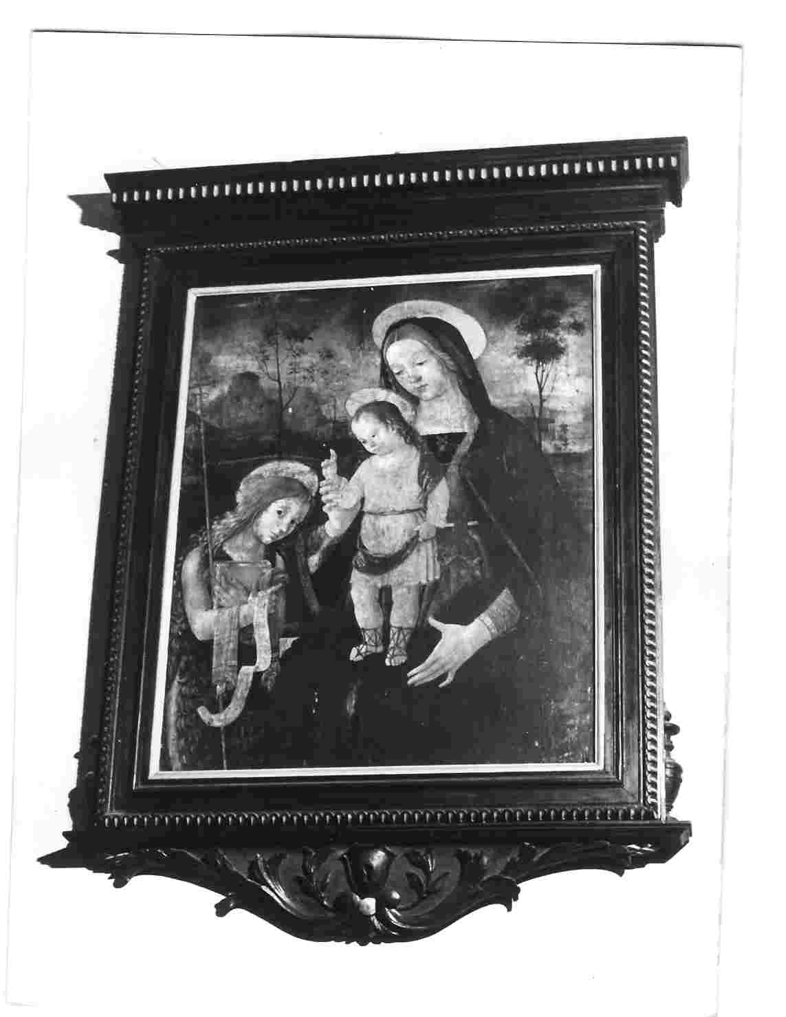 Personaggi: Madonna; S. Giovannino; Gesù Bambino. Attributi: ( S. Giovannino) bastoncino cruciforme; Vangelo. Paesaggi: rocce; alberi