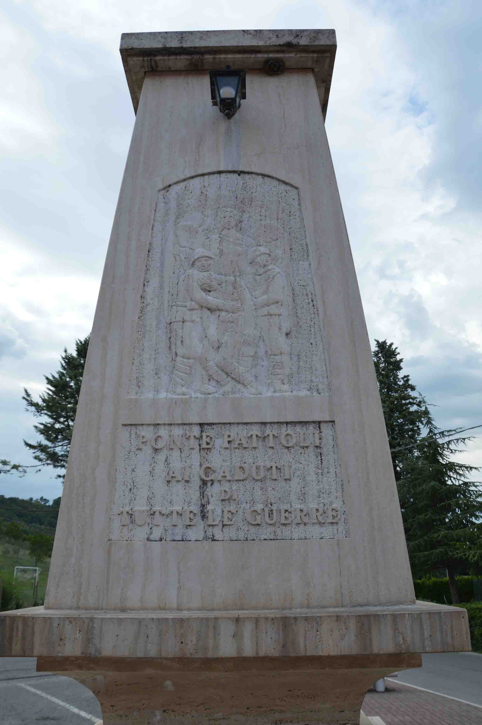 - ISCRIZIONI su una delle facce dell'obelisco - PONTE PATTOLI AI CADUTI DI TUTTE LE GUERRE 1915-1918 Capitano Monnarelli Luciano, Cap. Mag. Sensi Sestilio, Caporale Angelelli Ferdinando, Bordellini Vittorio, Brizzi Virgilio, Braca Gettulio, Bicini Leone, Soldato Sensi Mariano, Braca Domenico, Pucciarini Gettulio, Turchetti Osvaldo, Fressoia Adamo, Ricotti Giuseppe, Milletti Pietro, Angeli Enrico, Goracci Giulio, Ceccagnoli Giuseppe, Fratini Giulio, Pannacci Lorenzo, Pannacci Augusto, Vergoni Dante, Ferracci Francesco, Cecchetti Augusto, Angelelli Giuseppe, Bellucci Giuseppe 1940-1945 Tenente Mignini Albino, Sergente Maggiore Bioli Guido, Caporale Rosi Bruno, Soldato Chiabolotti Amerigo, Ricci Enrico, Rossi Gino, Vinti Adriano, Palazzetti Primo - non determinabile -