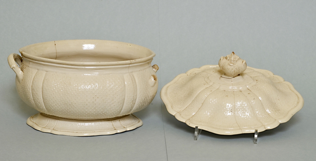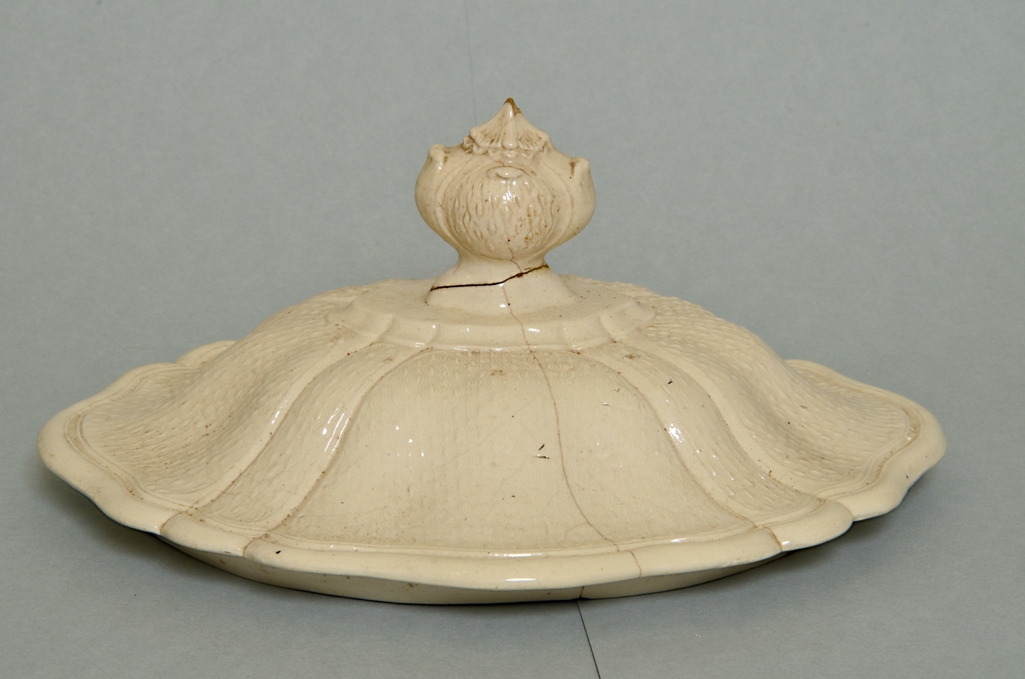 Contenitore a due manici, di forma ovale, con base mistilinea, con lavorazione a rilievo a motivi geometrici. Il coperchio con pomolo a cipolla