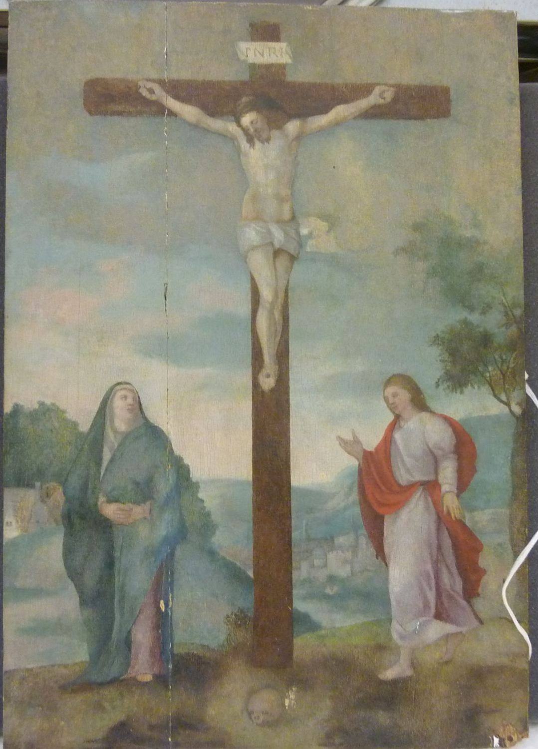- NOTIZIE STORICO CRITICHE La Crocifissione si staglia su un paesaggio dalle tinte cristalline, le figure del Cristo, della Vergine e di san Giovanni sembrano disegnare un ideale triangolo sullo sfondo. L'atmosfera pacata e l'equilibrio formale dell'impaginazione e dei singoli personaggi richiamano modelli del Rinascimento dell'Italia centrale e in particolare dell'Umbria. Nel XVII secolo, infatti, la pittura peruginesca e raffaellesca ha ispirato lo stile di grandi artisti come Giovanni Battista Salvi, detto il Sassoferrato, e questa tela potrebbe appartenere a questo medesimo filone di recupero della pittura rinascimentale in chiave classicista