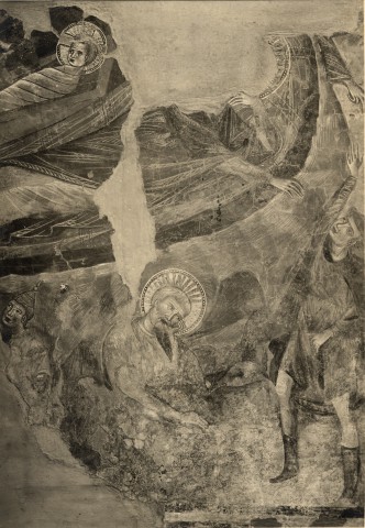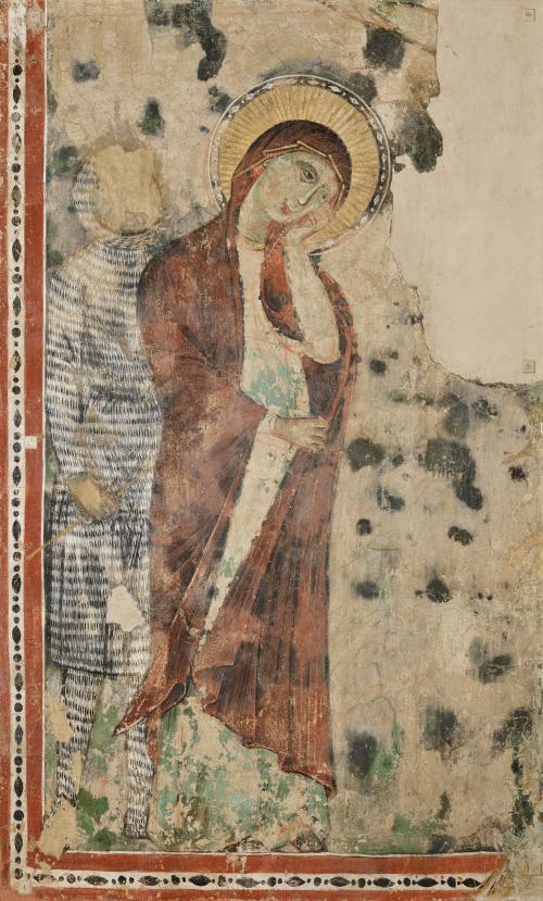 - NOTIZIE STORICO CRITICHE Il ciclo di affreschi dell'ex monastero delle Palazze in Spoleto è noto per una complessa vicenda che ne ha comportato il distacco clandestino e la dispersione in vari musei internazionali nel corso degli anni Venti del secolo passato. La scoperta nel 1957 di alcuni brani pittorici superstiti all'interno dell'edificio ha permesso il recupero di tre affreschi e di quattro sinopie. Un primo gruppo fu staccato nel 1964 e acquisito dal Comune di Spoleto nel 1982. I due dipinti staccati nel 1972, raffiguranti rispettivamente la Maestà tra i santi Francesco e Chiara e la Crocifissione, sono stati acquistati nel 2004 dallo Stato e attualmente sono di proprietà del Ministero della Cultura (cfr. Capolavori Trecento 2018, pp. 184-186). Nel convento femminile delle Palazze l’anonimo artista ha dipinto affreschi in due diversi ambienti: al pianterreno c’erano due scene con la Madonna con il Bambino tra San Francesco e Santa Chiara e una Crocifissione, mentre al primo piano si svolgeva un ciclo decorativo che comprendeva Storie di Cristo, una Parusia e una Madonna della Misericordia. Bruno Toscano nel 1974, nel suo primo contributo dedicato alle pitture delle Palazze, ne sottolineava i caratteri formalmente cimabueschi assieme alla vena narrativa e alla forza espressiva legate ad un linguaggio figurativo di matrice spoletina. Delpriori, in accordo con la lettura di Toscano, sottolinea inoltre la presenza di numerosi dettagli che mostrano una dipendenza dell’anonimo frescante dalle novità irradiate dal cantiere assisiate, ritenendo plausibile una datazione degli affreschi delle Palazze verso la fine del XIII secolo e più precisamente ai primi anni dell’ultimo decennio (Delpriori 2015, p. 67). (Agg. 2021)
