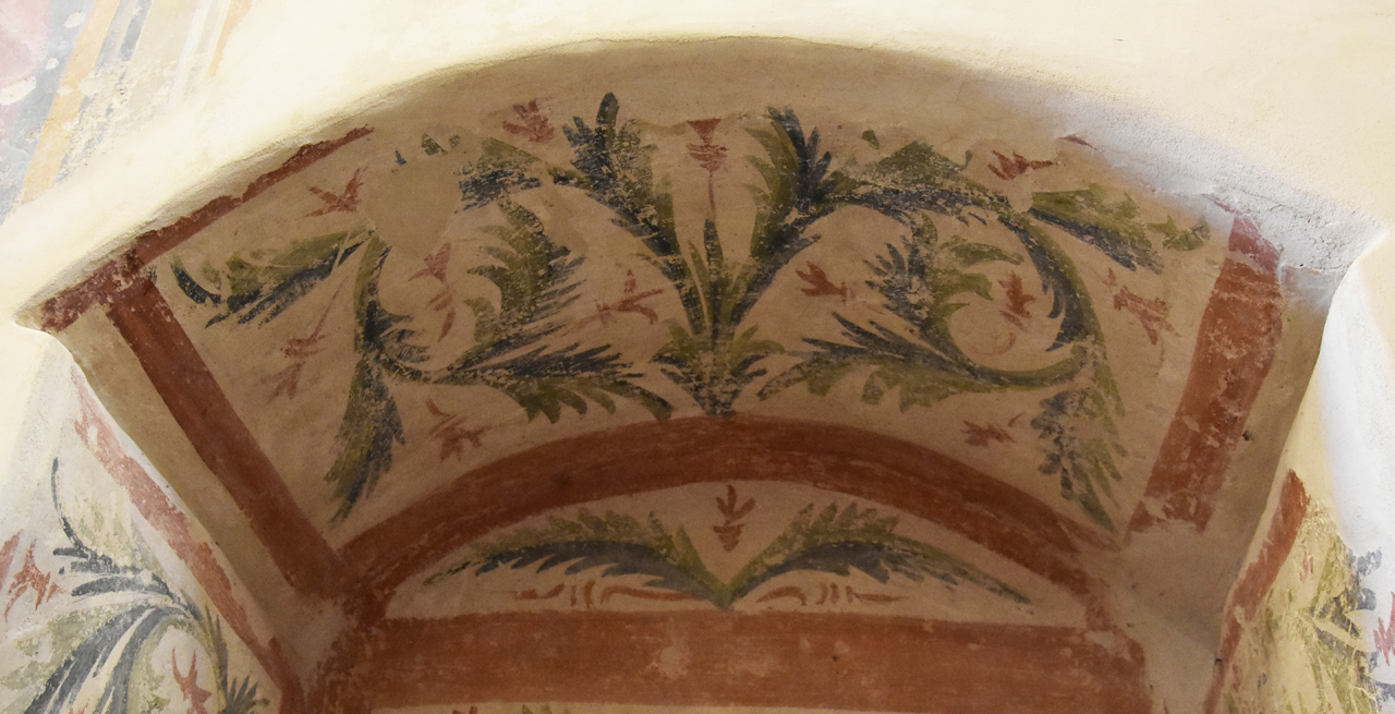 Nicchia centinata decorata nell'archivolto, nella parete di fondo e negli sguanci da un motivo vegetale, piuttosto stilizzato, composto da lunghe foglie con profilo frastagliato punteggiate di fiori rossi. Le composizioni si ripetono all'interno di riquadri sovrapposti delimitati da larghe bande rosse