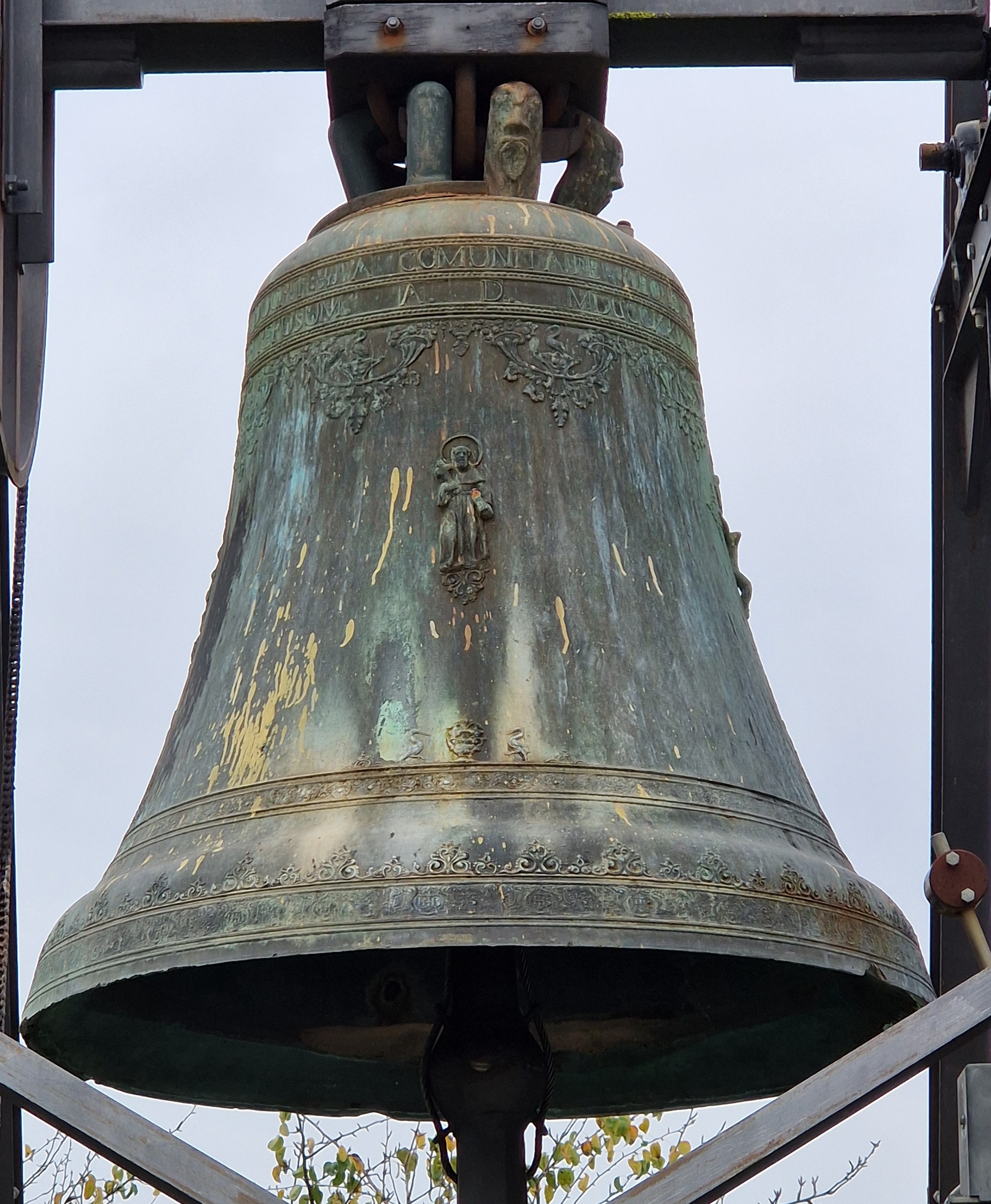 Campana in bronzo fuso con ghirlanda di fiori presso il castello, quattro figure sbalzate e festoni alla base