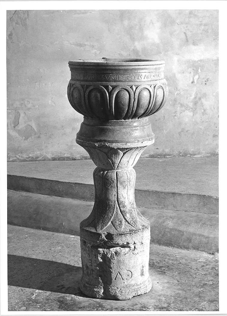 - NOTIZIE STORICO CRITICHE Tre pezzi diversi compongono l'acquasantiera: la base, venuta alla luce in seguito agli scavi condotti nel 1957, è materiale i recupero, come pure la base stilizzata riferibile al secolo XV, mentre la vasca che originariamente doveva essere a muro poichè tuttora presenta gli attacchi di ferro , risale alla seconda metà del XVI secolo