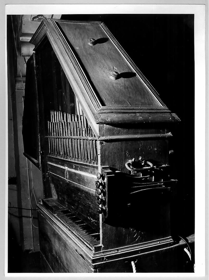- NOTIZIE STORICO CRITICHE nell'organo non esistono timbri o iscrizioni che possano chiarire l'origine e la fabbricazione. Si tratta in ogni caso di uno strumento antico, da far risalire ai primi del '600, anche perchè oltre tale periodo non furono più costruiti organi portativi. Nell'Archivio della Confraternita non si hanno notizie relative all'acquisto dello strumento, mentre sono ricordati due successivi restauri