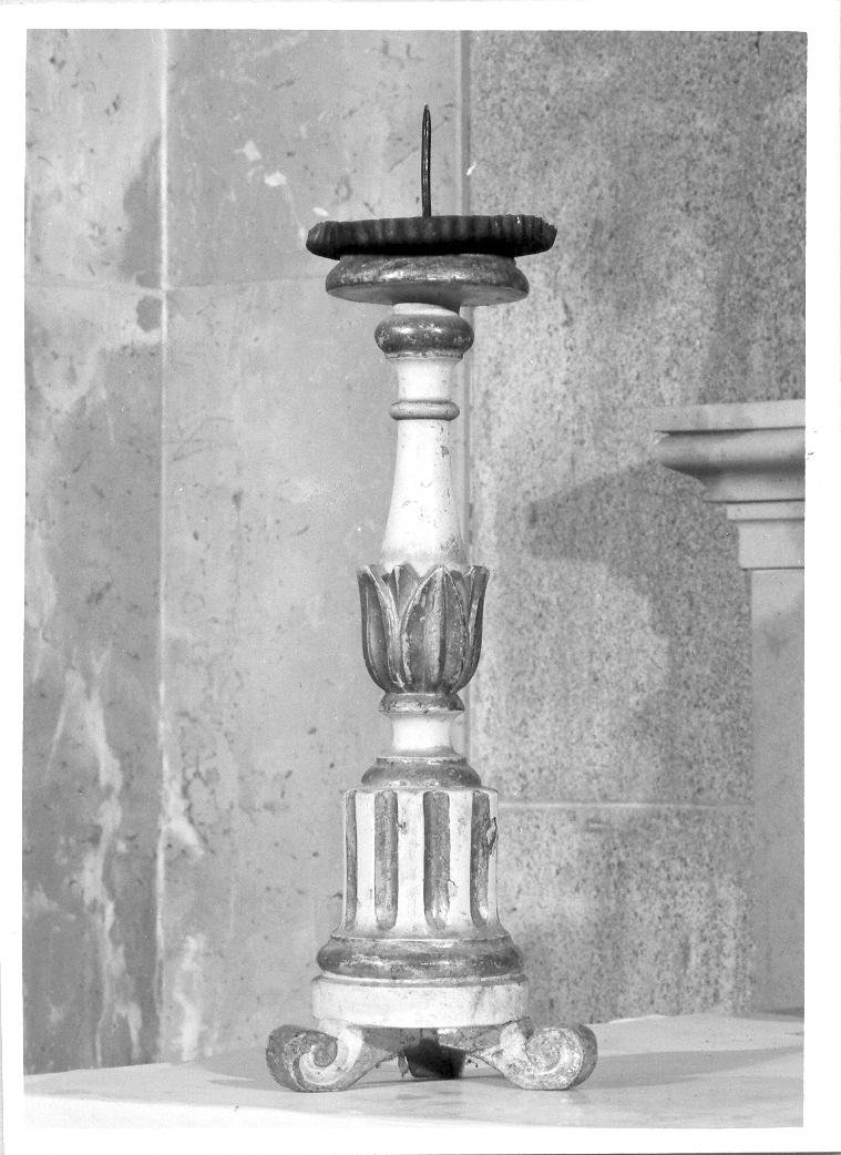 Candelieri in legno dorato e dipinto in bianco con piedi a voluta che sostengono un fusto scanalato. Sopra di esso un calice formato da più foglie racchiude una colonnina con due nodi e una larga base superiore