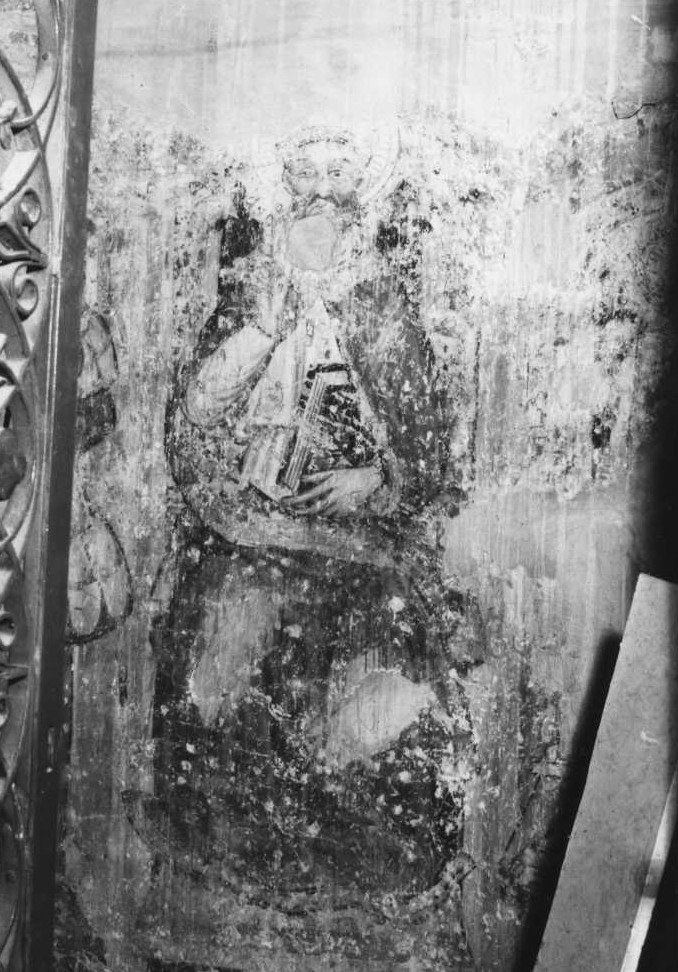 - NOTIZIE STORICO CRITICHE L'identificazione in S. Liberato del Santo Vescovo raffigurato nel dipinto è dovuta ad una notizia riportata sulla rivista "VI Centenario di s. Nicola da Tolentino-Periodico mensile in preparazione alle feste del sesto centenario" (Tolentino, marzo 1900, n. 3, pag. 116 in base alla quale in un piccolo vano oscuro sito a sinistra della porta d'ingresso della chiesa di S. Francesco sarebbe stato trovato un "S. Liberato con S. Eligio (S. Alò) protettore dei fabbri col martello alla mano". Il S. Eligio non è più visibile. L'aureola incisa, il volto e gli occhi del Santo fanno collocare l'opera nel sec. XV; l'autore potrebbe essere lo stesso degli affreschi descritti precedentemente. (VI Centenario di S. Nicola da Tolentino-Periodico mensile in preparazione alle feste del sesto centenario", Tolentino, anno II, marzo 1900, n. 3, p. 116)