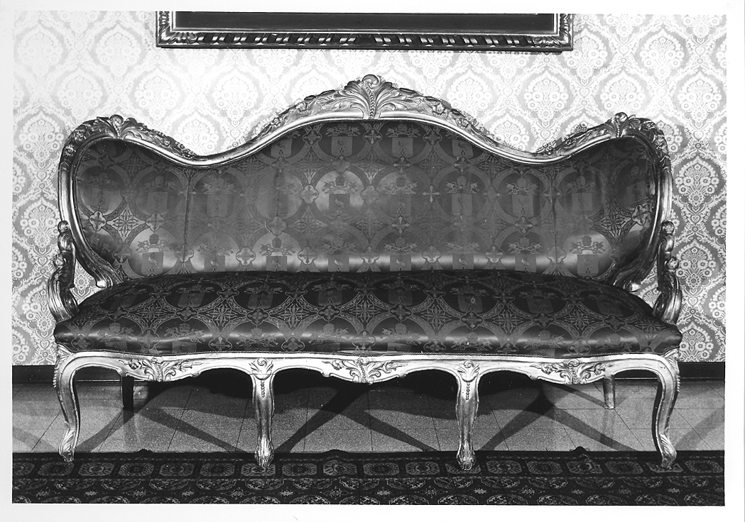 La serie di mobili è riccamente decorata con stoffa di seta damascata con stemma di Pio XII. Ha forma mossa con decorazioni a grappoli di fiori e perlinatura