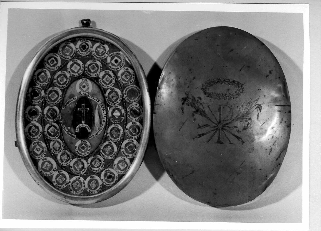 Reliquiario a capsula ovale con coperchio inciso con il monogramma P X incrociate e due palme legate con nastrini svolazzanti sormontato da una corona di foglie stilizzate. L'oggetto contiene reliquie del Cristo, della Vergine, di San Giuseppe e di San Terenzio, circondate da due ovali che contengono a loro volta altre reliquie di santi