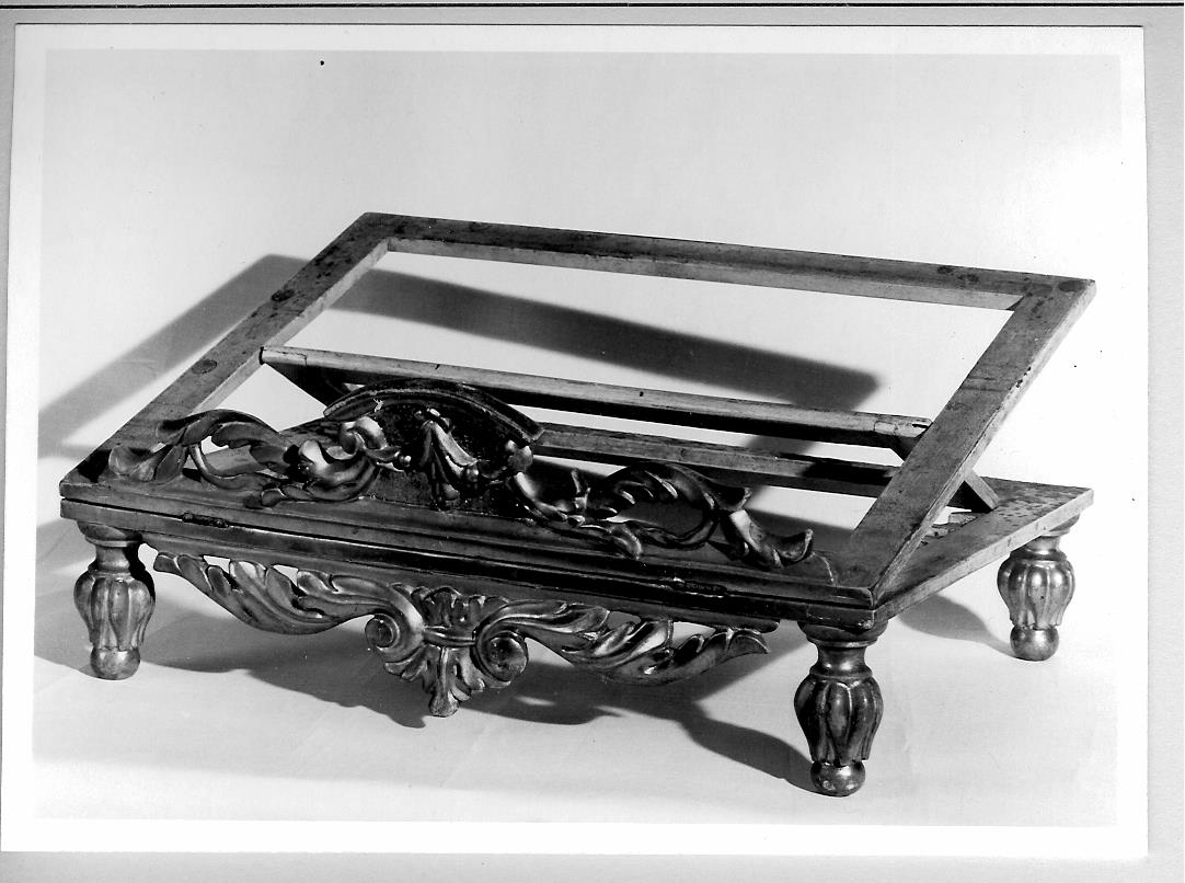 Leggio d'altare su piedini a bulbo di foglie e fermalibro composto da un motivo di foglie arricciate che sorreggono un timpano arcuato, cui corrisponde sul lato inferiore un fregio di volute contrapposte di foglie