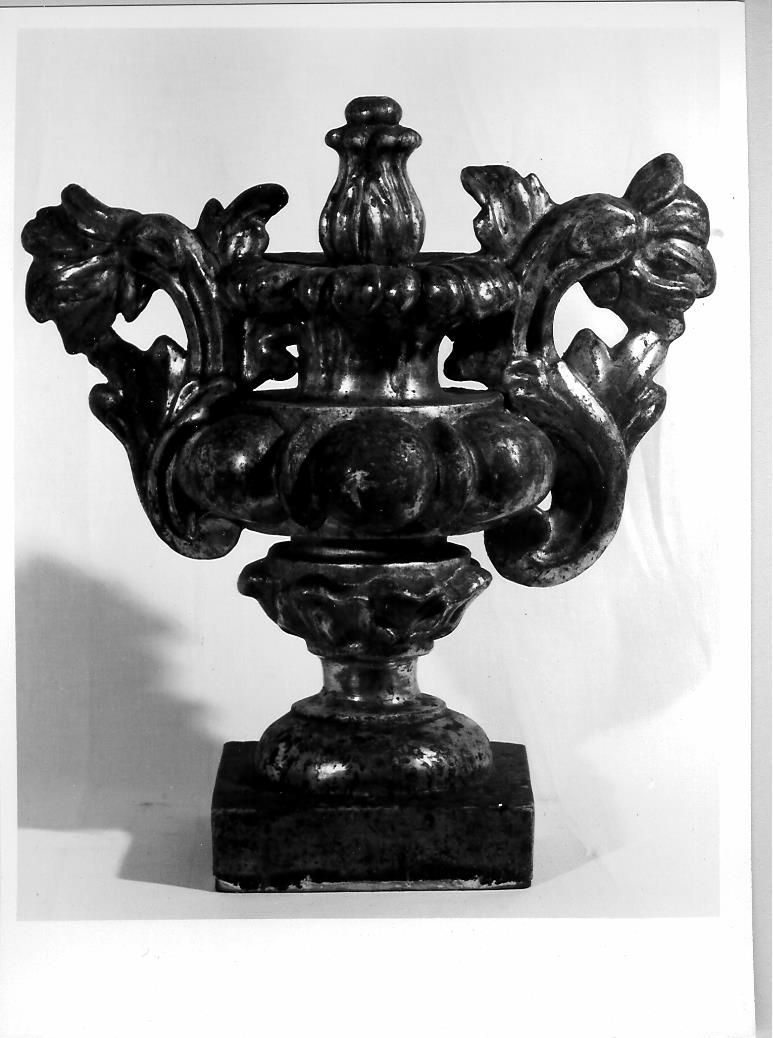 Vaso d'altare a forma di lampada pensile panciuta con grosse semisfere sporgenti, collo strozzato e anse composte da due spesse volute adorne di foglie stilizzate