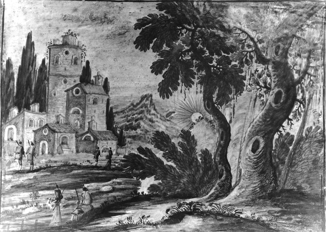 I tronchi nodosi di due quercie occupano quasi interamente la parte destra mattonella, a sinistra si stagliano alcune abitazioni dominate dalla mole di una torre rotonda; sullo sfondo il sole tramonta dietro la vetta aguzza di una montagna